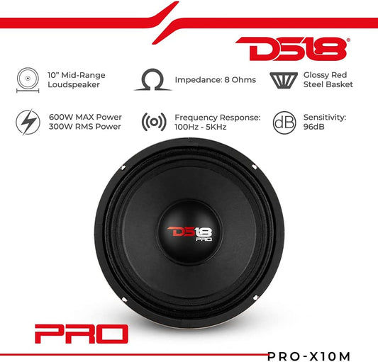 PRO-X10M Loudspeaker - 10", Midrange, Red Steel Basket, 600W Max, 300W RMS, 8 Ohms - Premium Quality Audio Door Speakers for Car or Truck Stereo Sound System (1 Speaker), Classic
